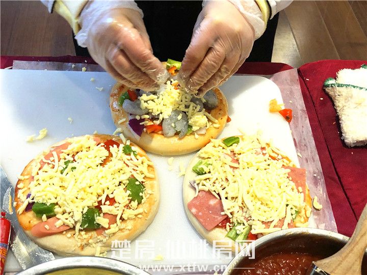 在精心的摆盘时,大家还不忘互相交流经验,比如:只有芝士放的多,披萨拉丝口感才好;熏肉垫底就放青红椒中和香味等等,每一道工序都源自大家对食材的尊重和挑剔,每一道工序都像是一场征服味蕾的体验之旅。