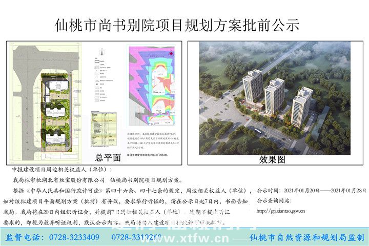 2021年1月20日,仙桃市自然资源和规划局发布了尚书别院项目规划方案批前公示。