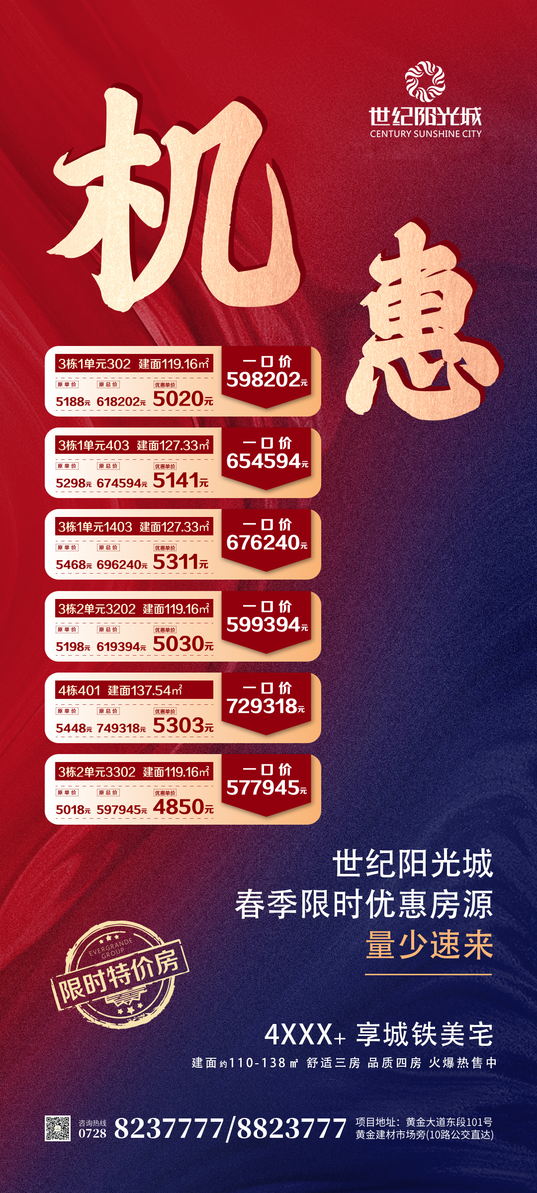 正如你所见,世纪阳光城考究户型的每一个细节,只为拉进人与光的距离。建筑面积约110㎡-137㎡三室两厅,餐客厅一体与景观阳台衔接,让阳光与清风毫无阻挡地入户。
