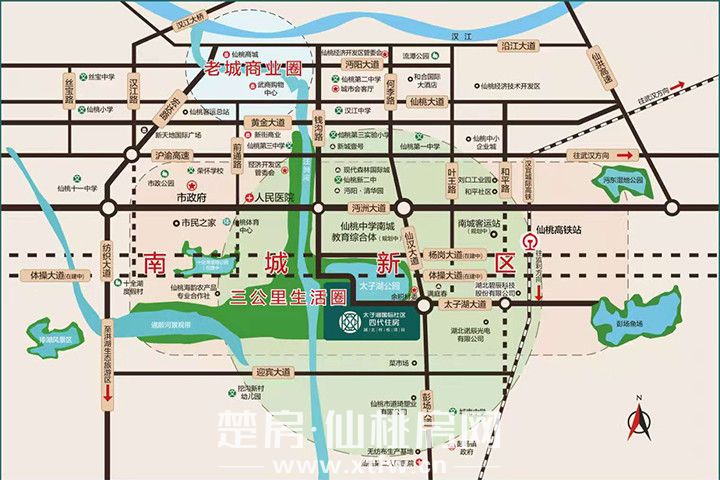 太子湖国际社区位于位于仙桃市彭场大道与太子湖大道交汇处隶属南城新区,作为城市发展新核级,集萃城市优渥资源,核芯价值毋庸置疑。周边还有仙桃市第一人民医院三甲优质医疗资源,九局、新市政府、新人民法院等,目前对应的学校是仙桃二中钱沟南路校区,可以满足居民衣食住行医疗等一站式需求。随着各种市政配套的不断完善,商、教、政、医、乐等生活配套日渐齐全,各种配套设施环伺左右,城市核芯生活自如。