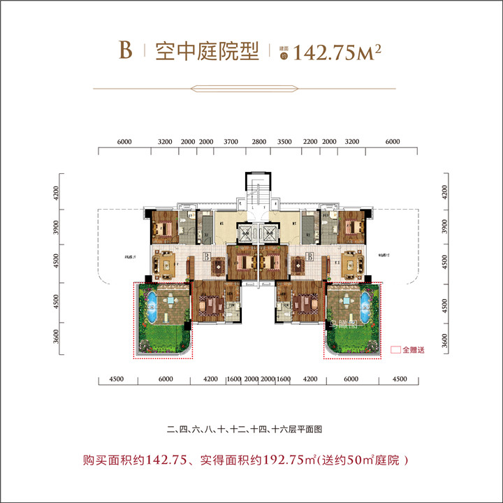 空中庭院户型让每户都有一个约50㎡私家前庭后院,一块几十平米的土地,种花、种菜、遛狗、养鸟自得其乐,还能自由打造成会客厅、棋牌室、阳光书房、儿童乐园等休闲空间。