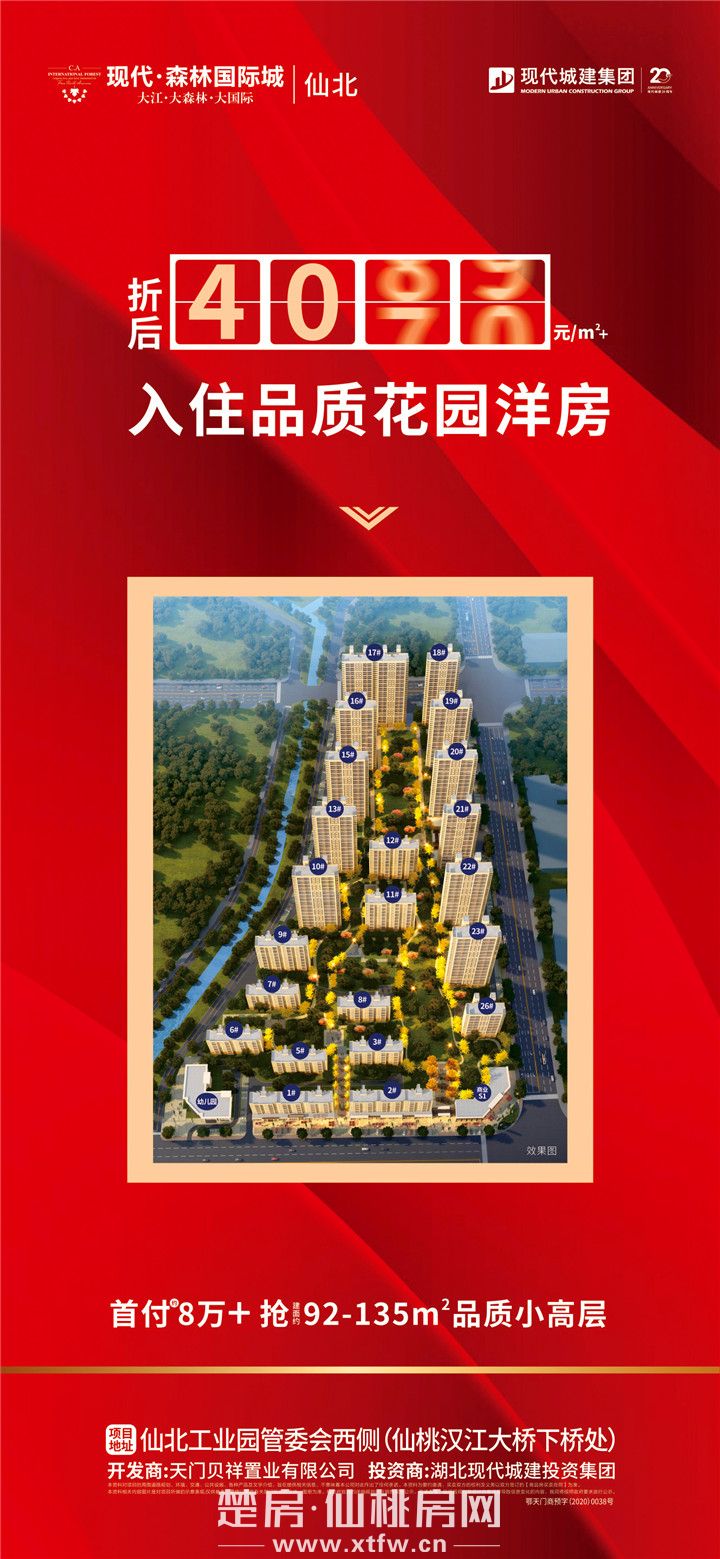 现代·森林国际城|仙北项目总体量30万方,容积率2.8,涵盖高层、小高层、洋房多类产品,内拥3.2万方森林系园林,打造全新生活主义。项目由现代城建集团倾心打造,集团深耕仙桃多年,倚汉江而立,外有江水景致,内有森系园林,居家于此,尽享鲜氧清新空气,目之所及,绿意荟萃,花团锦簇,四季美景各有千秋。