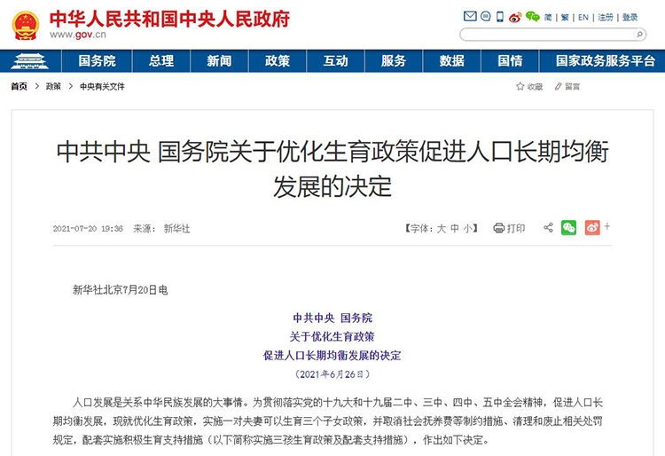 7月20日,《中共中央国务院关于优化生育政策促进人口长期均衡发展的决定》发布,决定明确指出“取消社会抚养费等制约措施、清理和废止相关处罚规定,配套实施积极生育支持措施”。