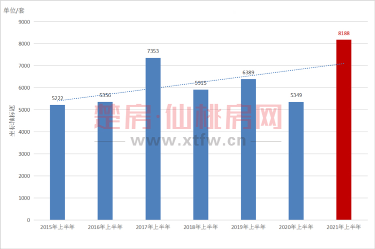 纵观上图,2021年上半年对比之前成交套数上,创7年来历史新高。按照以往数据进行测算:2019年累计成交约14000套,2020年的累计成交约13000套。2021年上半年仙桃累计成交套数已超过8000套,由此预估今年的成交量超过去年会是大概率事件。