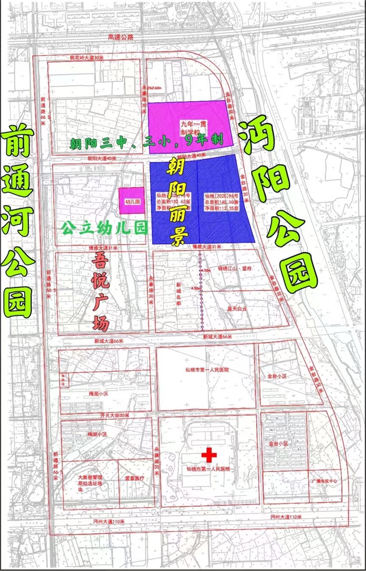 项目占据南城新区“三横三纵”立体路网,北侧朝阳大道,南侧新城大道,西侧是永康路,出行方便,便捷交通,四通八达。项目北侧的朝阳大道连接东西几大社区,永康路向北延伸可到达沔街商业圈,特色美食生活街、好邻居等大小商业圈。充分满足业主日常生活购物需求;周边范围内涵盖仙桃商业综合体—武商,生活配套完善,业主可尽享便利生活。项目西南面还有在建的新商圈仙桃吾悦广场,商圈环绕,丰富业主休闲娱乐。 朝阳丽景将会是一个集居住、商业、娱乐、教育、医疗、生态为一体的综合项目。