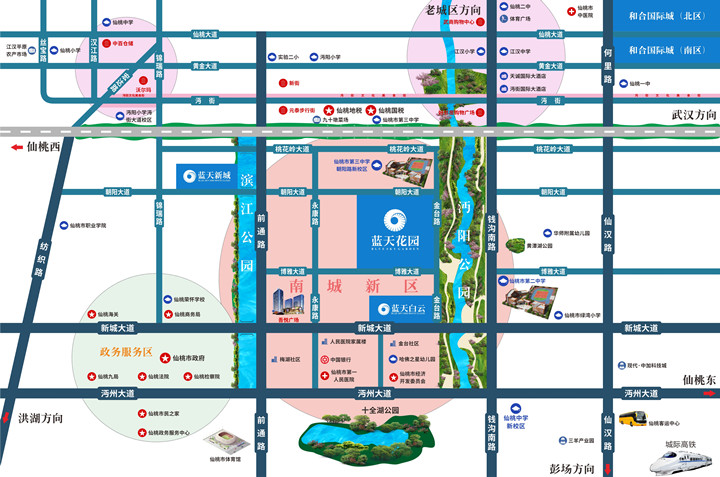 蓝天花园所处交通便利,朝阳大道、博雅大道、金台路三条交通主干道纵横交错,出行便利。16、18、19、20路公交停靠,快速通达仙桃。还可快速到达仙桃高铁站、南城汽车客运站(建设中),出行更加便利。