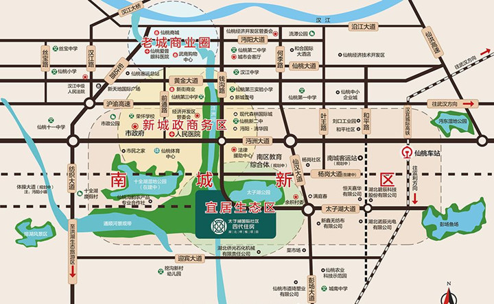 太子湖国际社区位于仙桃市彭场大道与太子湖大道交汇处,周边交通路网纵横交错,出行便捷。且邻近高铁小镇,仙桃城铁站和南城汽车客运站,一家人旅游出行,通达各地,诗与远方,触手可及。