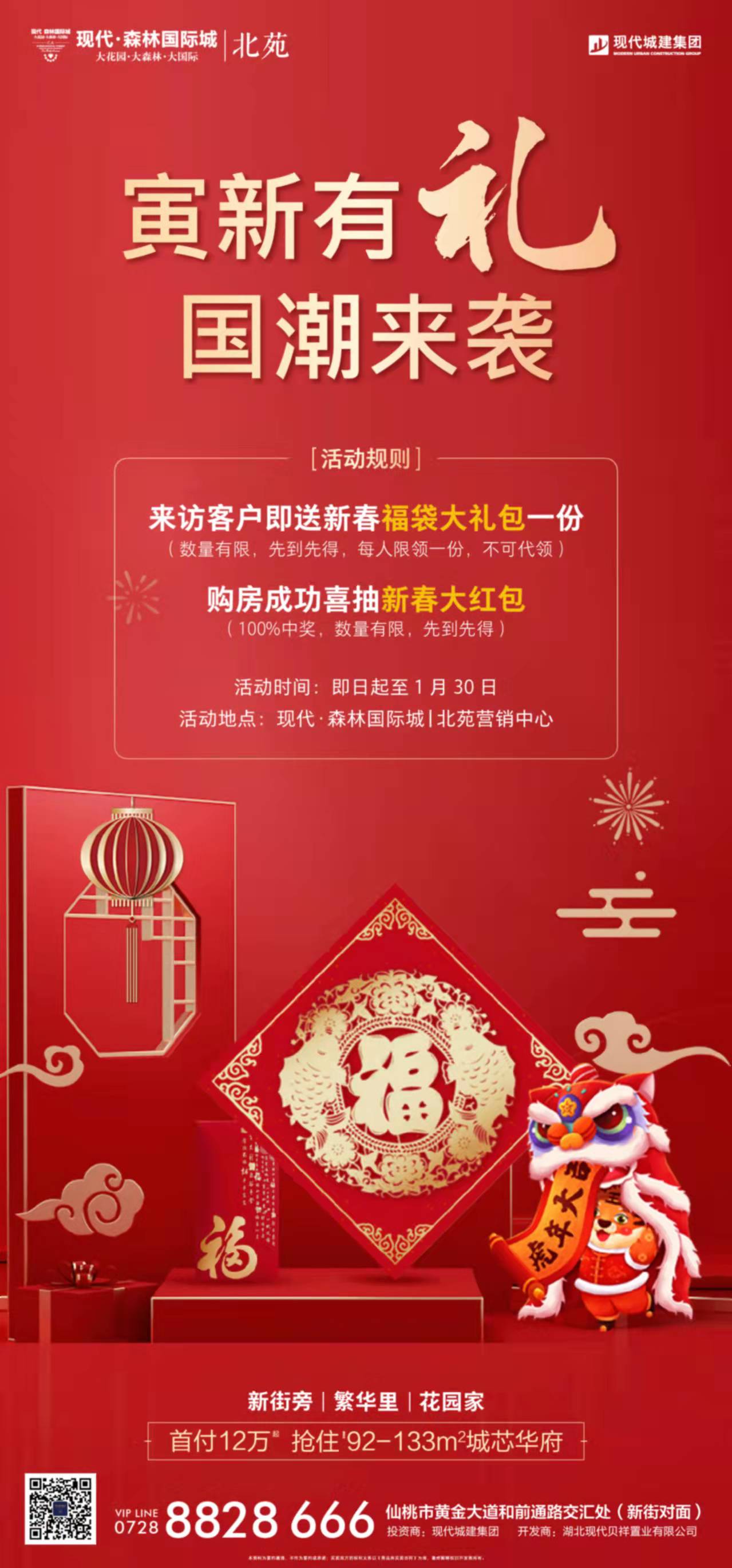 我们共同迎来新的一年,一起分享对新年的喜悦与期盼,恭候归家游子的到来,只要到访【现代·森林国际城|北苑】营销中心即可领取新春福袋大礼包一份,另外购房成功的客户均可抽取新春大礼包,人人有奖,数量有限,领完即止。