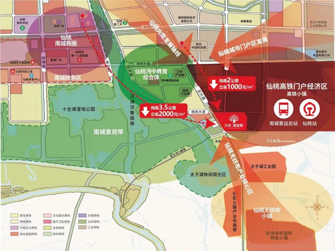 而交投·满庭春是区域内距仙桃城际高铁站、客运站、高速路、产业园,较近的商住建设用地。不仅如此,在城区向南发展及无纺布重点产业北移的双重作用推动下,将率先占据土地红利。