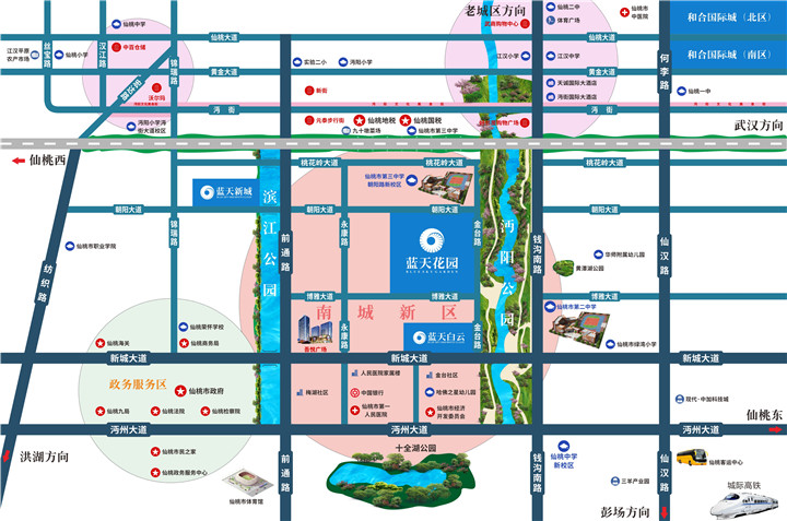 向东,沔阳公园生态绿肺就映入眼帘,满满的负氧离子跟随着徐徐吹来的清风,为您带来富氧生活。出门即是沔阳公园,包括了十三处景点和周边的休闲娱乐设施,形成了"一河、两片、六区、十二桥、十三景"的开放式生态人文景观 。健康的生态就在身边,健康的生活也不请自来。
