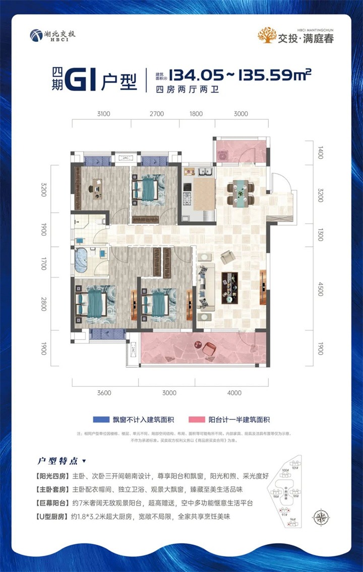 科学布局建面约135㎡宽阔四室空间,拥有双联大阳台+干湿分离的卫浴+带有飘窗的主卧,实用性强、舒适度高,可满足多代家庭的空间需求。