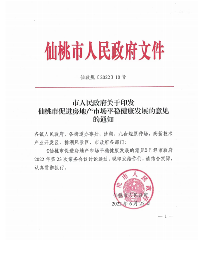2022年6月25日,仙桃市出台了《市人民政府关于印发仙桃市促进房地产市场平稳健康发展的意见的通知》(仙政规〔2022〕10号)。文件明确了对仙桃的房企和购房者给予了相应的宽松政策,包括购房契税补贴、提取公积金等方面共计13条内容。