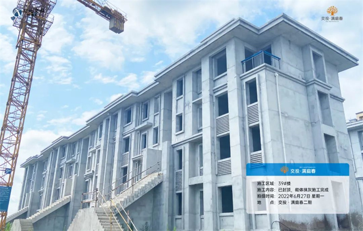 项目二期叠墅B37/B38/B39/B50/B51/B52号楼已封顶,砌体抹灰施工完成。