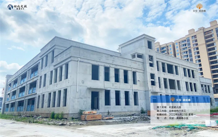 社区幼儿园主体结构已完工,砌体抹灰施工完成,外立面正在施工中,窗户、阳台围栏等正在安装中;