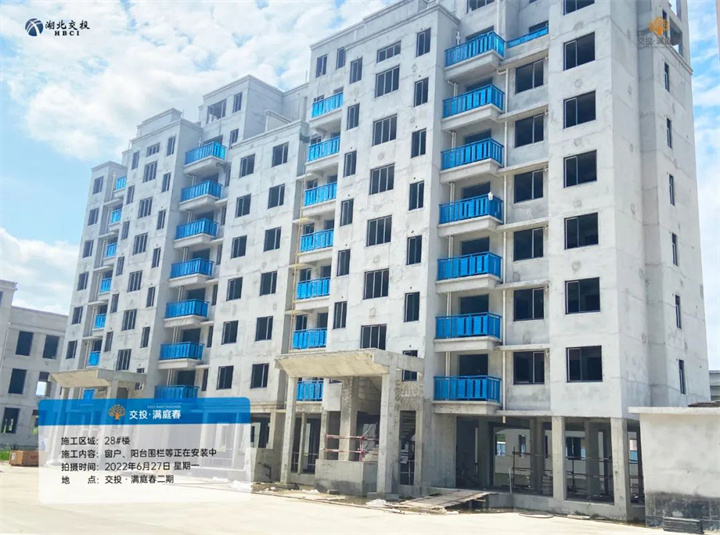 项目二期洋房Y28/Y29/Y30/Y31/Y33/Y35号楼已封顶,砌体抹灰施工完成,外立面正在施工中,窗户、阳台围栏等正在安装中;
