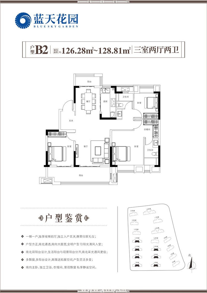 蓝天花园匠心设计建面约126㎡舒适三房户型