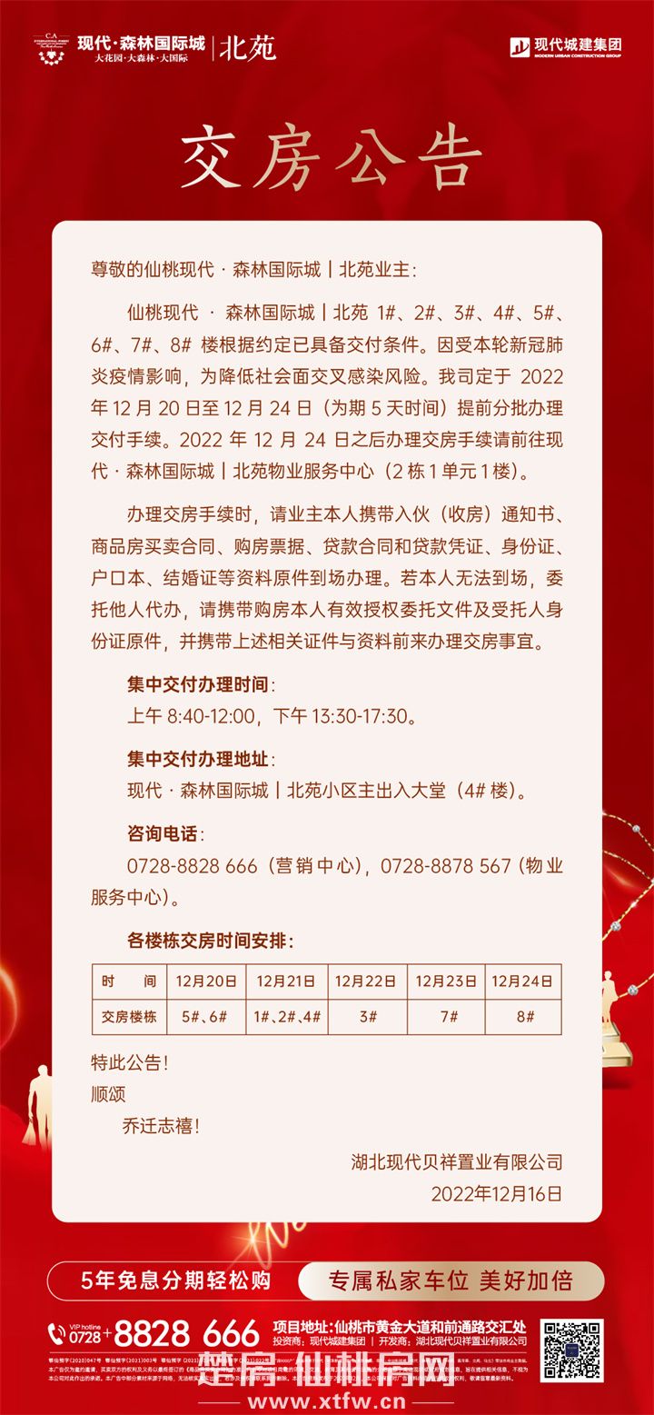 仙桃现代·森林国际城|北苑1#、2#、3#、4#、5#、6#、7#、8#根据约定已具备交付条件,因受本轮新冠疫情影响,为降低社会面交叉感染风险,交房时间定于2022年12月20日至12月24日(为期5天时间)提前分批次办理交付手续,请大家注意各楼栋交付时间。