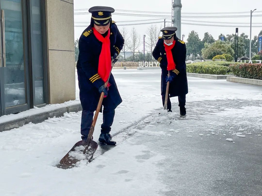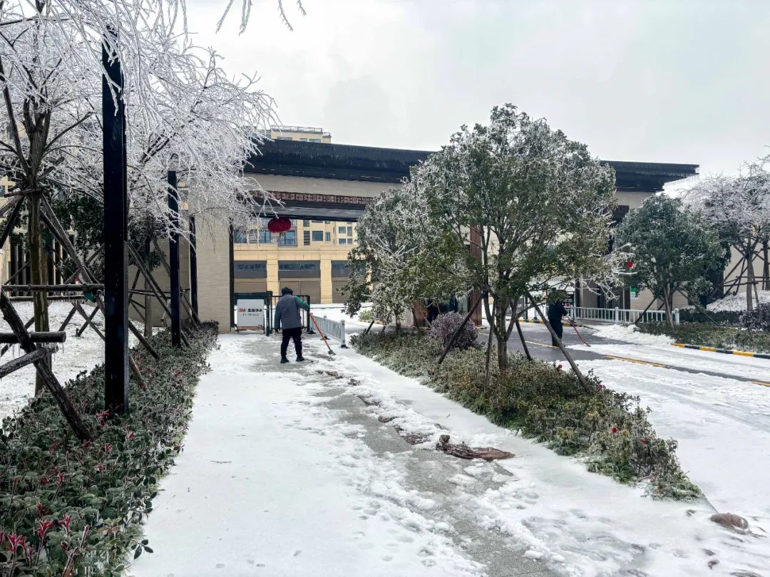 工作人员正在及时清扫积雪,