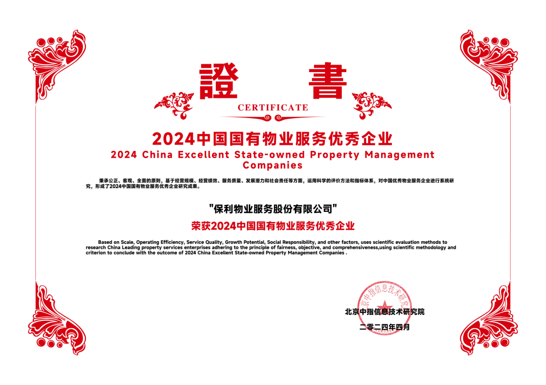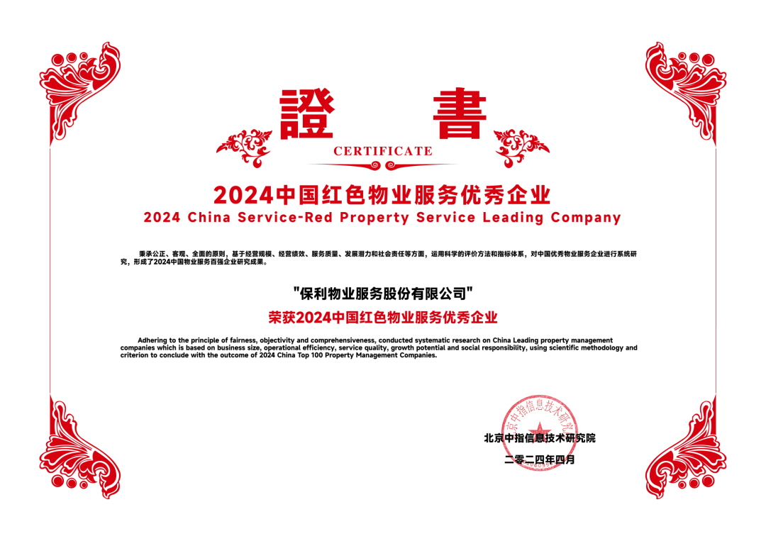2024年4月18日,由中指信息技术研究院主办的“2024中国物业服务百强企业研究成果发布会”在北京隆重举行。保利物业凭借过硬的综合实力及不断精进的品牌实力,再度荣膺“2024中国物业服务百强企业”重量级奖项,以卓越实力跃居行业第二、央企第一,并荣获另外六大奖项,再创新高。