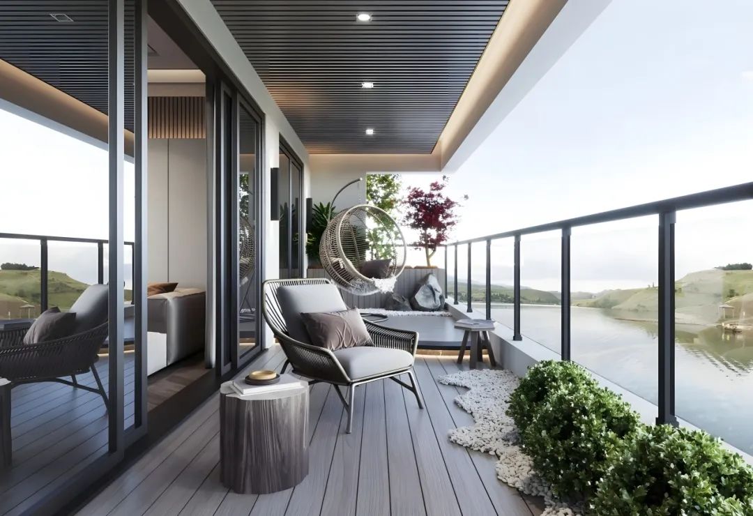 在此可摆放茶桌藤椅、种植花草绿植,打造为一处诗意盎然的私家花园。凭栏而望,窗外即是园林美境,足不出户便可将自然美景尽收眼底,可谓是一处空中观景台。无论是与家人、朋友聚会,还是独处,惬意的休闲时光随心而至。