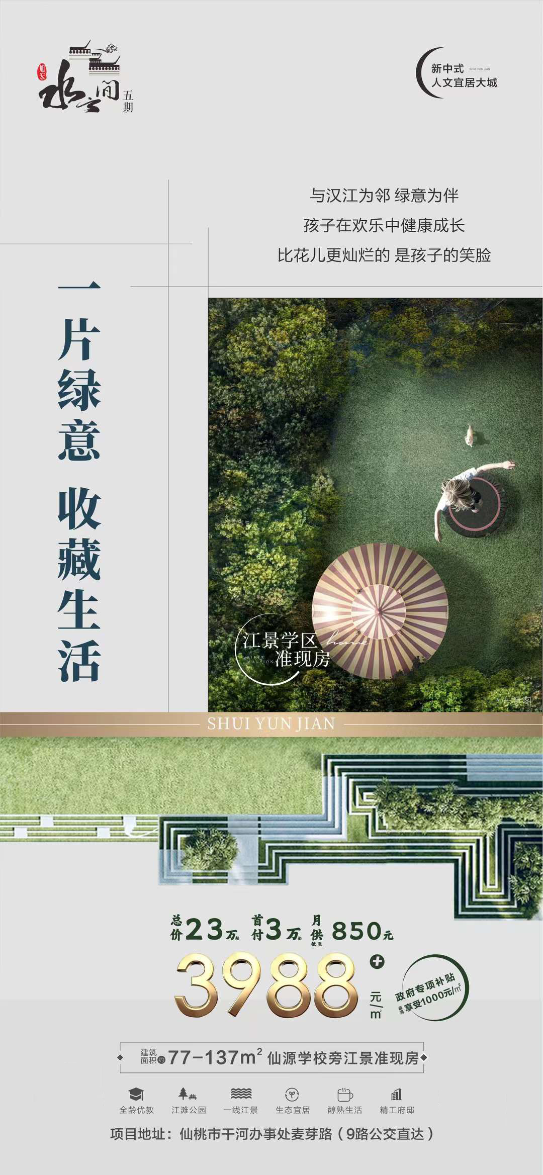 江滩公园内,多种生态景观集中展现,汉江水穿城而过,天蓝、地绿、水清,推窗可见,为水云间五期业主的日常生活赋予更多惬意。