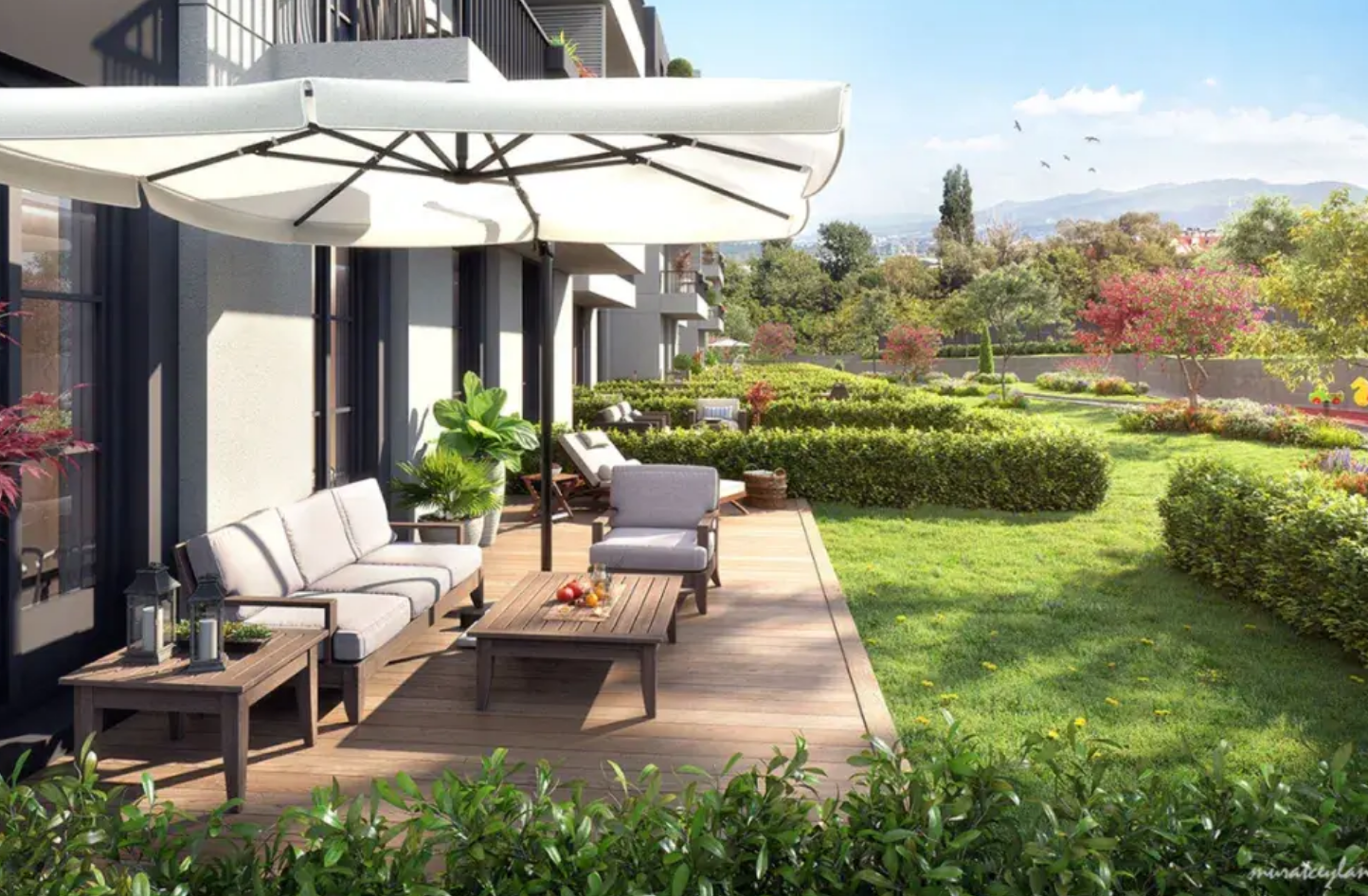 下叠配备观景门廊,营造归家仪式感的同时,也成为过渡性的休闲空间。尤其是185㎡下叠的拐角门廊设计,摆放藤椅与茶桌后即可形成专属休闲区,晚风轻拂时,为日常休憩提供舒适场景。