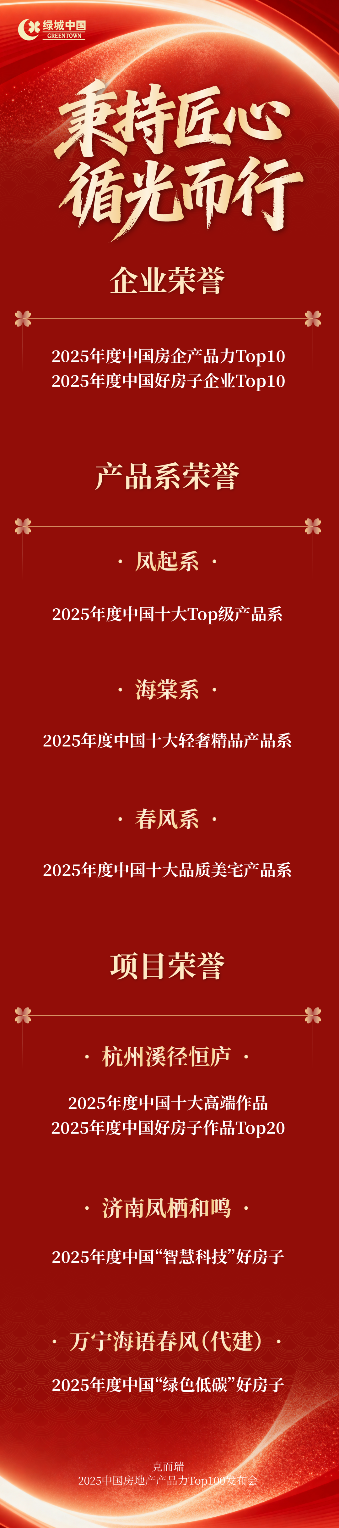 12月24日,在亿翰智库举办的2025超级产品力年度大会现场,绿城获评“2025中国房企超级产品力Top1”、“2025中国房企超级交付力Top1”、“2025中国房企超级服务力Top1”、“2025中国房企社群运营典范”、“2025中国代建企业产品力Top1”、“2025中国代建企业好房子赋能力Top10”;《绿城中国好房子产品标准》获评“2025中国房企十大好房子营造体系”;绿城“凤起系”获评“2025中国房企十大豪宅产品线”,“云庐系”获评“2025中国房企十大高端产品线”;义乌凤起潮鸣、北京和樾玉鸣、杭州奥映鸣翠、杭州吉祥里、嘉兴馥香园等众多项目收获荣誉。(信息来源于“亿翰智库”)