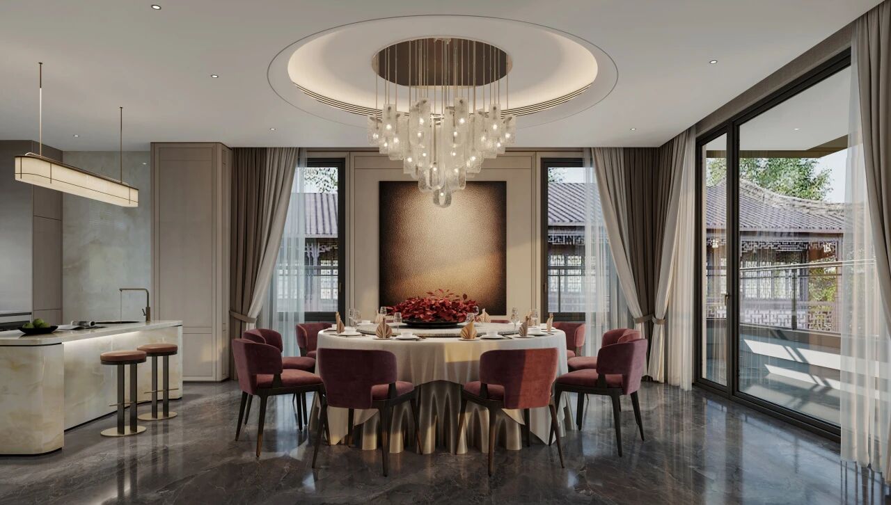 在此大开大合的空间尺度上,绿城・桃李春风还通过借鉴宋画“框景”手法,以南向落地玻璃将庭院绿意延入室内,打造举目皆景的环幕级视野,家人于此欢聚时,整座庭院风光尽收眼底,愉悦感也油然而生。