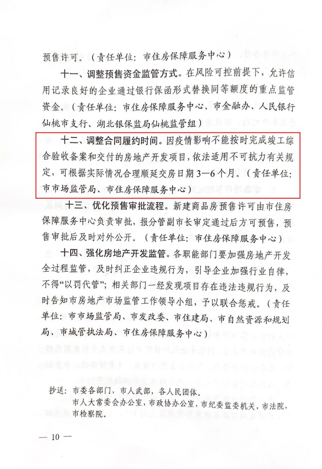 受疫情影响,仙桃市人民政府办公室于2020年6月18日印发了《促进建筑业平稳健康发展的措施》和《促进房地产市场平稳健康发展的措施》,文件明确指出:“因疫情影响不能按时完成竣工综合验收备案和交付的房地产开发项目,依法适用不可抗力的有关规定,可根据实际情况合理顺延交房日期3-6个月。”根据【民法通则】及《合同法》等相关法律规定,因不可抗力而不能履行合同的,不承担民事责任。