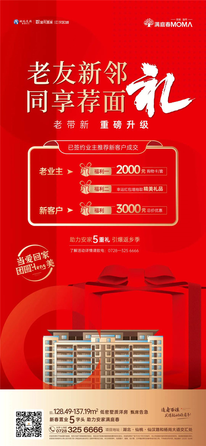 推荐升级,凡本项目已签约业主推荐新客户成交奖励2000元购物卡,新认购客户总房款优惠3000元/套,推荐洋房额外领取旺旺大礼包1份