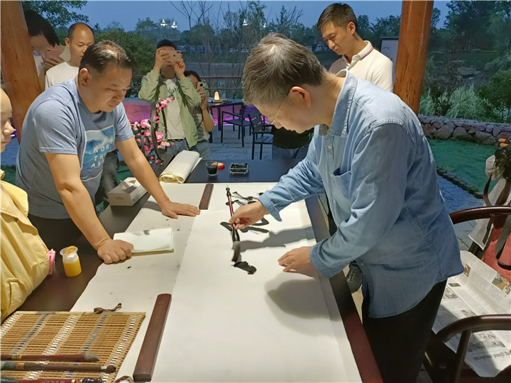 礼仪小姐展示着大师的作品,字体间流淌的中华汉字深邃的意境与风骨,让来访客户纷纷问询,以期甄藏。而现场,书法大师更为沔阳小镇·云野梦田欣然挥毫泼墨,笔势雄健洒脱、遒劲有力,精彩演绎着书法艺术的魅力,现场沉寂在浓郁的文化氛围之中。