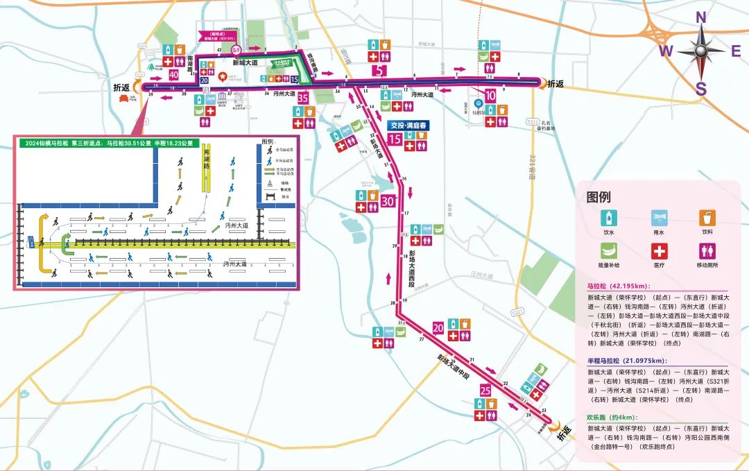 1.马拉松:新城大道荣怀集团(起点)→(东直行)新城大道→(右转)钱沟南路→(左转)沔州大道(S321折返)→(左转)彭场大道→彭场大道西段→彭场大道中段(千秋北街)(折返)→彭场大道西段→彭场大道→(左转)沔州大道(S214折返)→(左转)南湖路→(右转)新城大道荣怀集团(终点)