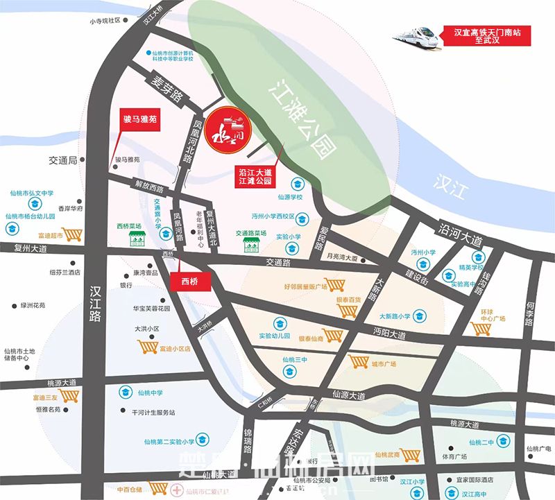 水云间五期项目位于仙桃城区繁华中芯,九路公交起始站、江滩公园旁、小学初中一体的仙源学校在侧的好地段。