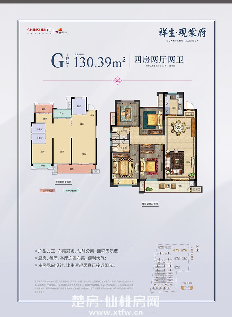 目前主推户型建筑面积约105㎡—130㎡户型,精致考究,匠心独运,采用朝南宽厅设计。客厅连通大面积阳台,保证了整个大厅的采光,另外,客厅和餐厅南北相连,人性化设计,用餐比较方便,且视觉上显得户型面积比较大。