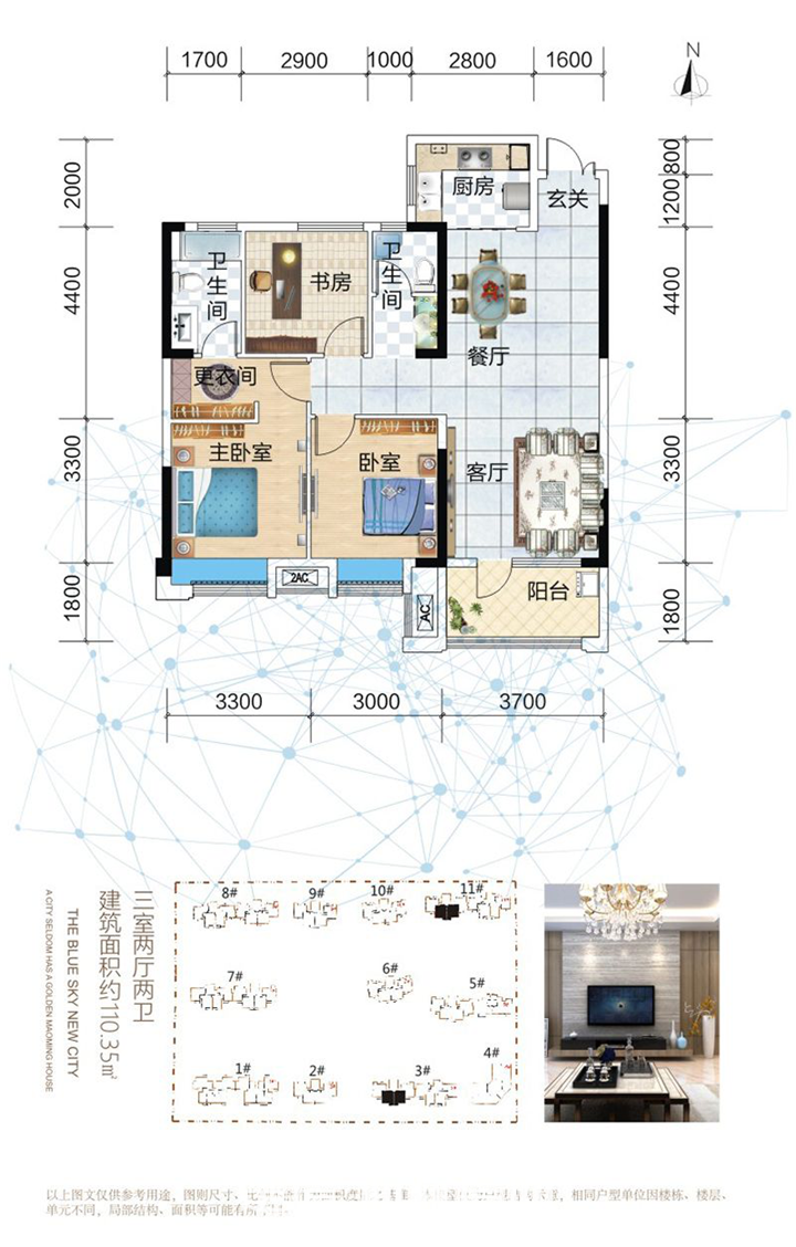 建面约110平的三房两厅两卫