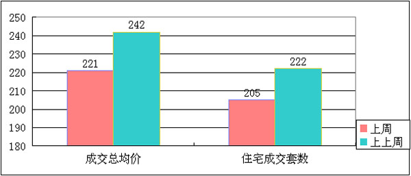 上周相对上上周,总成交量减少,住宅成交量相应较少,非住宅成交量上上周为20套,上周为16套。