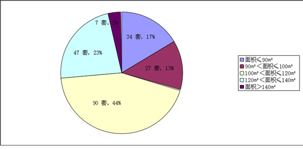 00㎡到120㎡的中等户型占比44%,有90套;120㎡到140㎡的大户型占比23%,有47套;90㎡到100㎡的中小户型占比13%,有27套;小于90㎡为17%,有34套。