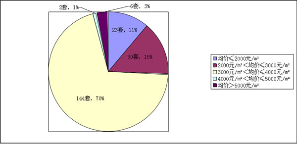 均价在3000元/㎡到4000元/㎡之间的住宅占总比的70%,说明是仙桃地区住宅销售市场及被消费者普遍接受的价格;均价在2000元/㎡以下和均价在2000元/㎡和3000元/㎡之间占比分别为11%、15%;均价高于4000元/㎡和小于2000元/㎡的占比很小。