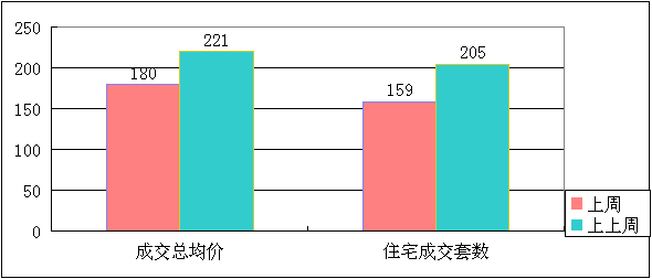 上周相对上上周,总成交量减少,住宅成交量相应较少,非住宅成交量上上周为16套,上周为21套。