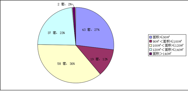 100㎡到120㎡的中等户型占比36%,有58套;120㎡到140㎡的大户型占比23%,有37套;90㎡到100㎡的中小户型占比12%,有19套;小于90㎡为27%,有43套。