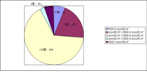 均价在3000元/㎡到4000元/㎡之间的住宅占总比的66%,说明是仙桃地区住宅销售市场及被消费者普遍接受的价格;均价在2000元/㎡以下和均价在2000元/㎡和3000元/㎡之间占比分别为6%、20%;均价高于4000元/㎡和小于2000元/㎡的占比很小。
