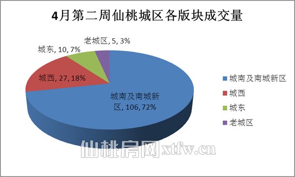 城南版块依然保持版块地位,4月二周城南和南城新区成交量占到总比的72%,这主要得益于南城新区的新开盘楼盘的现代·森林国际城的。