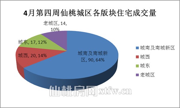 4月四周城南及南城新区共成交住宅90套,占到整个城区成交量的64%,其他三个区域占比相差不大,城西为14%、城东为12%、老城区为10%。城南及南城新区这一周以的销量成为这周的热点版块。