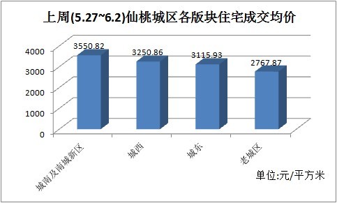 图三:上周(5.27~6.2)仙桃城区各版块住宅成交均价(元/平米)
