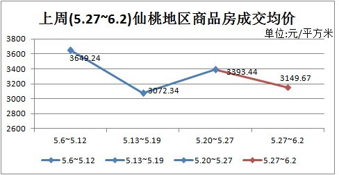 与商品房的销售套数一样,上周的商品房成交均价也有些下降。上周(5.27~6.2)仙桃地区商品房成交均价为3149.67元/平方米。