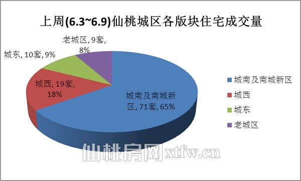 仙桃城区各版块的成交量依然维持以往的销售状态,城南及南城新区销量好。这周城南及南城新区销售住宅71套,占据仙桃城区住宅销售量的65%。城西版块销售住宅19套,占比18%,次于城南及南城新区。老城区和城东这周分别销售住宅9、10套,占比很少。