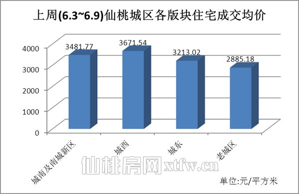 图三:上周(6.3~6.9)仙桃城区各版块住宅成交均价