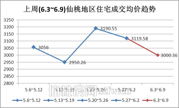 仙桃地区(包含部分乡镇楼盘)的住宅成交均价上周(6.3~6.9)有所下降,均价为3000.36元/平方米。总体来看,仙桃地区住宅均价波动不大,一直维持在3000元/平方米左右。
