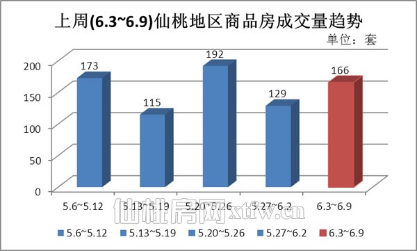 相比5月前几周,上周(6.3~6.9)的销量有所上升,这周销售商品房166套。