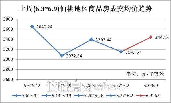 与商品房的销售套数一样,上周商品房的成交均价也略微上扬。上周(6.3~6.9)仙桃地区商品房成交均价为3442.2元/平方米。